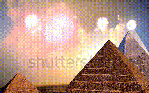 Fireworks explode over the pyramids.