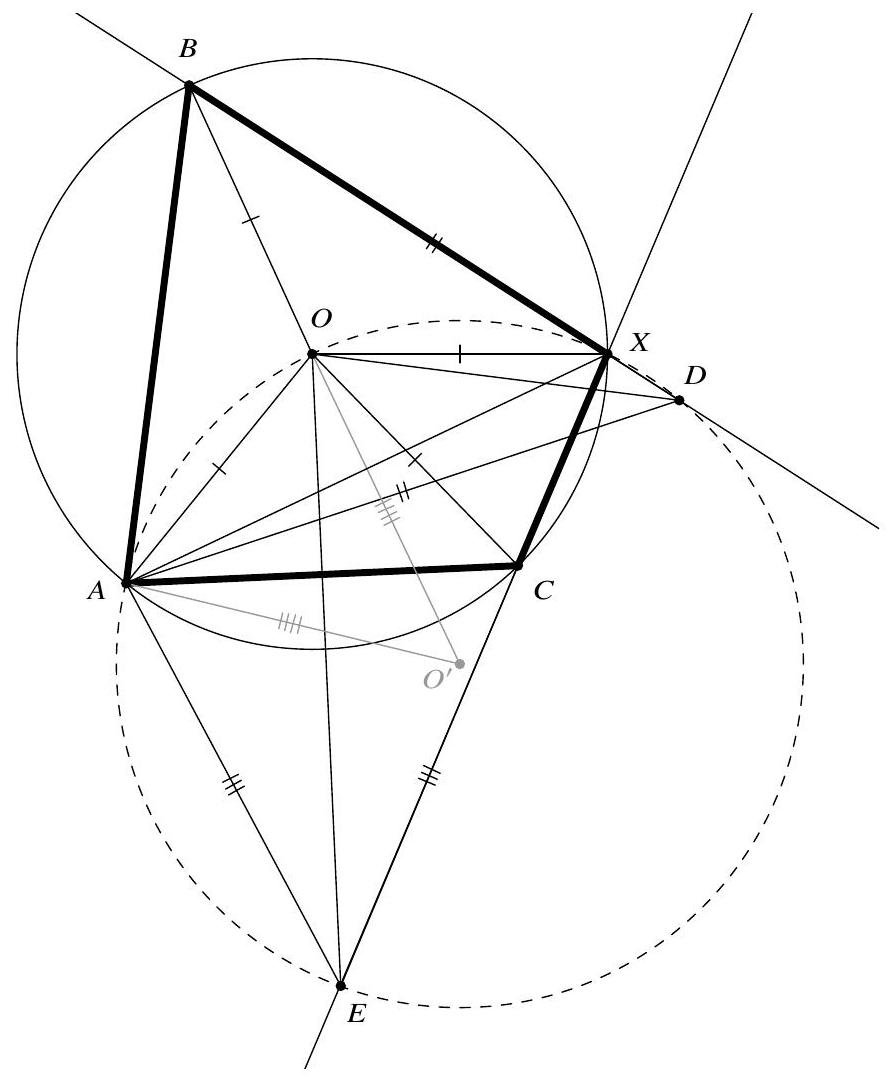 In this solution, we use directed angles $\measuredangle$. We have $\measuredangle A B D=\measuredangle A B X=\measuredangle A C X=\measuredangle A C E$ and since $\triangle A B D$ and $\triangle A C E$ are both isosceles, we see that $\triangle A B D \sim \triangle A C E$ with equal orientation. This means that there exists a spiral symmetry $T$ with centre $A$ such that $T(B)=D$ and $T(C)=E$. Now let $O^{\prime}$ be the centre of $\odot D E X$. Then we find $\measuredangle D O^{\prime} E=2 \measuredangle D X E=2 \measuredangle B X C=\measuredangle B O C$. Moreover, $\triangle D O^{\prime} E$ and $\triangle B O C$ are isosceles, so we have $\triangle D O^{\prime} E \sim \triangle B O C$ with equal orientation. This means that $T$ must send $O$ to $O^{\prime}$, so in particular, $\triangle A O O^{\prime}$ is similar to $\triangle A B D$ and $\triangle A C E$. We conclude that $\left|A O^{\prime}\right|=\left|O O^{\prime}\right|$, from which the result follows.