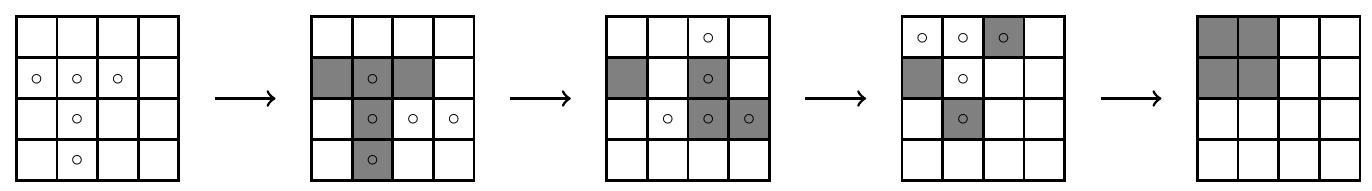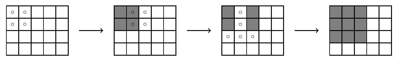 Nu hebben we dus open en gesloten paden van orthogonale rode lijnen die alleen van richt- ing veranderen in het midden van de vakjes. Als we de vakjes in een schaakbordpatroon kleuren, dan zijn de vakjes waardoor het pad loopt om-en-om zwart en wit. Een gesloten cykel gaat dus altijd door een even aantal vakjes. Als het bord een oneven aantal vak- jes heeft, dan is er dus minstens één open pad. En dit open pad heeft twee bijzondere driehoeken aan de uiteindes. □