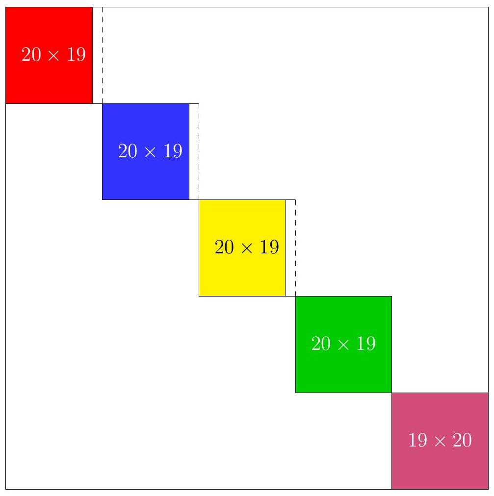 Comme chaque ligne ou colonne ne peut contenir qu'une couleur, on va réfléchir en partant des lignes. On dit qu'une ligne ou colonne est d'une couleur (disons rouge) quand la seule couleur que peuvent avoir des cases de cette ligne ou colonne est le rouge. Si une ligne ou colonne n'a pas de couleur, on lui assigne arbitrairement une couleur. Ainsi, une case rouge se trouve forcément à l'intersection d'une ligne rouge et d'une colonne rouge. Par conséquent, on peut majorer le nombre de case rouge par le produit du nombre de ligne rouges par le nombre de colonnes rouges. Introduisons maintenant des notations. On numérotes les couleurs disponibles de 1 à 5 et on note $x_{i}$ le nombre de lignes colorées de la i-ième couleur, et $y_{i}$ le nombre de colonnes colorées de cette couleur. Notons enfin N le nombre de cases coloriées par couleur. On veut maximiser le nombre total de cases coloriées, 5 N . Les arguments précédemment cités montrent que $\forall i: N \leqslant x_{i} y_{i}$. ON a évidemment aussi, $x_{1}+x_{2}+\ldots+x_{5}=y_{1}+y_{2}+\ldots y_{5}=99$. L'étude des petits cas nous montre que pour maximiser N il faut que les $x_{i}$ et les $y_{i}$ soient tous environs égaux, valant tous $\frac{99}{5}$ arrondi soit par excès ou par défaut. Une étude plus approfondie des petits cas où on remplace 99 par un petit nombre congru à $4 \bmod 5$, comme 99 , nous permet de conjecturer que la construction suivante est optimale :
