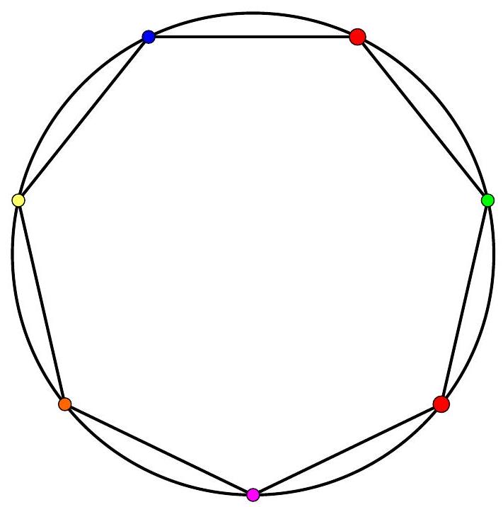 On porcède par l'absurde en supposant qu'aucun triplet de sommets coloriés ne forme de triangle isocèle.