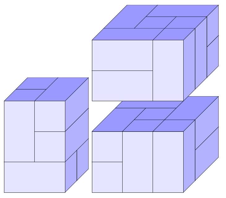 - Une dimension du pavé droit est divisible par 4 et une autre dimension est divisible par 3. Dans ce cas on sait comment paver ce pavé droit à l'aide des pavés $\mathbf{a} \times 4 \times 3$, $\boldsymbol{a}>1$.