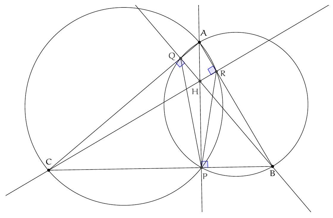 Soit $A B C$ un triangle non isocèle inscrit dans un cercle $\Gamma$ de rayon $R$. Le cercle passant par $A$ et tangent en $C$ à $[B C]$ recoupe le cercle passant par $B$ et tangent en $C$ à $[A C]$ au point D .