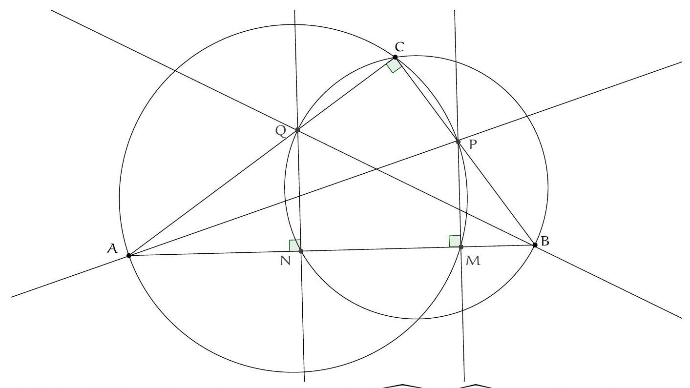 b) On va montrer que (CD) passe par le point de rencontre des tangentes en $A$ et $B$ au cercle circonscrit, que nous appellerons $S$. Il est connu que (CS) est la symédiane du triangle passant par C, donc il suffit de montrer que (CD) est une symédiane.