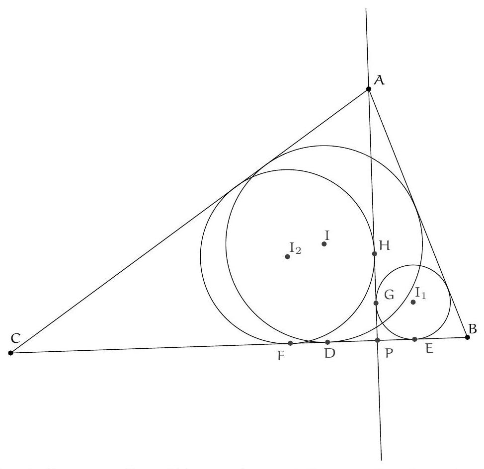 Soient $I$ et $J$ les milieux des côtés $[A B]$ et $[C D]$ respectivement. Les droites $(A B)$ et $(C D)$ se coupent au point $P$. Sans perte de généralité, on peut supposer que $P$ est le point d'intersection des demi-droites $[A B)$ et $[C D)$.