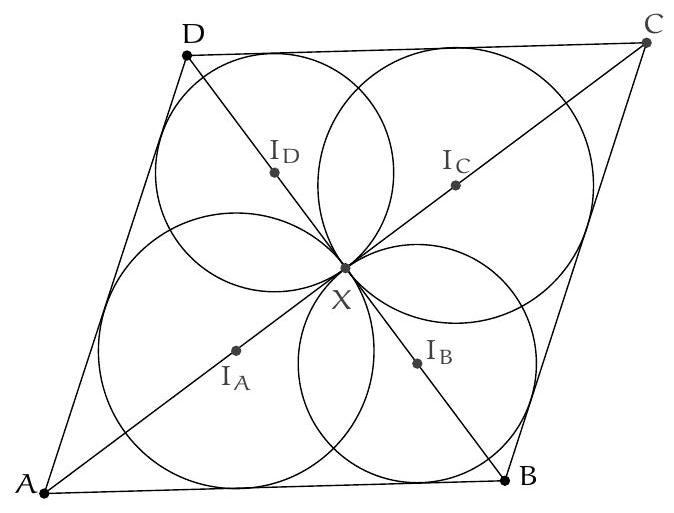 Then $\widehat{J C O}=\widehat{I O B}$ and the triangles $O I B$ and $C J O$ are similar. We obtain that $\frac{O B}{O C}=$ $\frac{I B}{J O}$. Similarly, we have $\frac{O A}{O D}=\frac{I A}{J O}$. Since $I B=I A$, we get $O A \cdot O C=O B \cdot O D$.