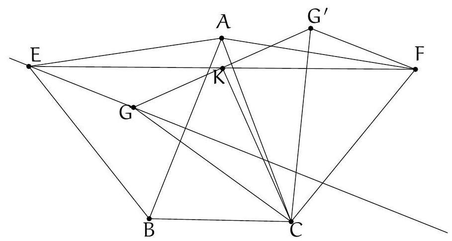 Or, F est obtenu à partir de $A$ en effectuant une rotation de $60^{\circ}$ sutour de C , donc cette rotation envoie le triangle GAC sur $\mathrm{G}^{\prime} \mathrm{FC}$. En particulier, $\mathrm{GC}=\mathrm{G}^{\prime} \mathrm{C}$ et $\widehat{\mathrm{GCG}^{\prime}}=60^{\circ}$, ce qui conclut.