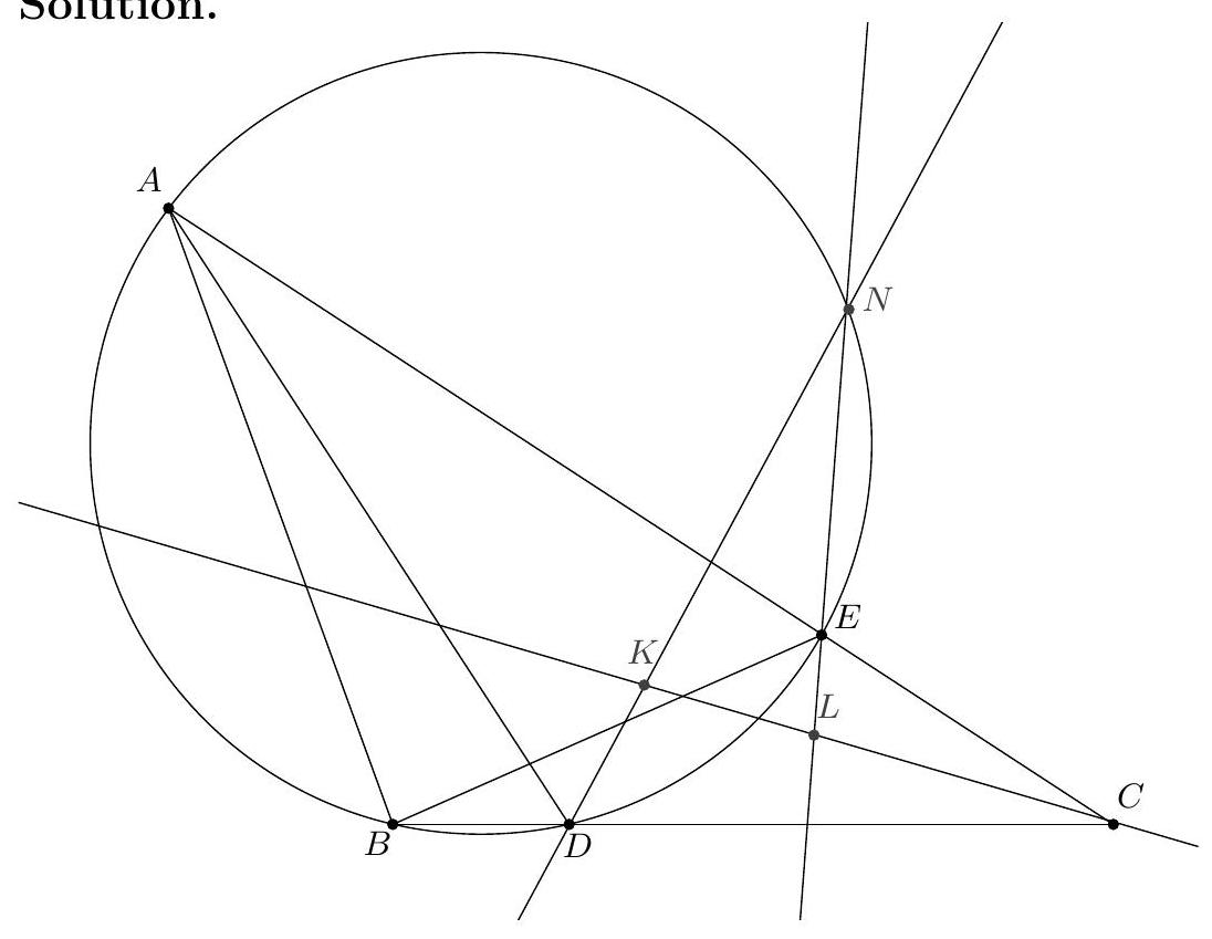 Soit $\omega$ le cercle de diamètre $[\mathrm{IJ}]$. Il contient les points B et C . Soit L le second point d'intersection de (KJ) avec $\omega$. On a $\overline{\mathrm{KL}} \cdot \overline{\mathrm{KJ}}=\overline{\mathrm{KB}} \cdot \overline{\mathrm{KC}}=\overline{\mathrm{KA}} \cdot \overline{\mathrm{KN}}$ donc $A, N, L$, J sont cocycliques.