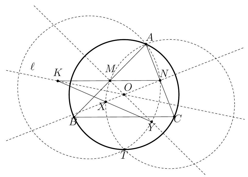 Furthermore, the circumcircle $\gamma$ of $A M T$ is symmetric with respect to $\ell$, i.e., $s(\gamma)=\gamma$, so $s(M)$ belongs to both $\gamma$ and $s(O M)=(O N)$. Necessarily, $s(M)=X$. Similarly, $s(N)=Y$. We deduce that $s(M N)=(X Y)$. The intersection point $K$ of $(M N)$ and $(X Y)$ thus lies on the line $\ell$, which implies that $K A=K T$.