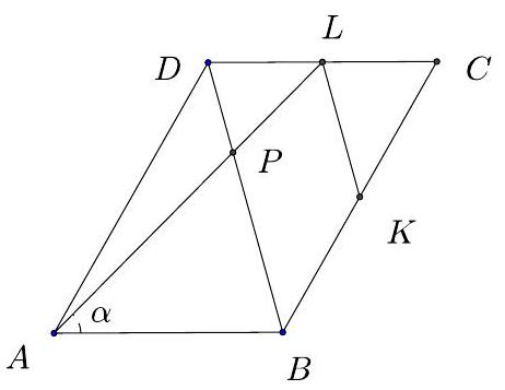 Now, observing that $a b+c d=\frac{T^{2}}{2}(\sin (2 \alpha)+\sin (2 \beta))=T^{2} \sin (\alpha+\beta) \cos (\alpha-\beta)$ and $a d+b c=T^{2} \sin (\alpha+\beta)$, we obtain $(a b+c d) /(a d+b c)=\cos (\alpha-\beta)=\sqrt{3} / 2$.