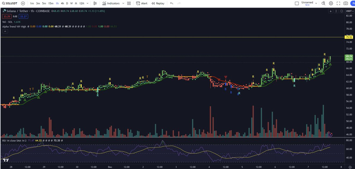 [{'ticker': '$SOL', 'exchanges': ['binance', 'kucoin'], 'price': '71.08', 'percentage_change': '+12.42%', '4h_ta_result': 'BUY', '4h_ta_details': '14 buy, 7 hold, 5 sell', '1d_ta_result': 'STRONG_BUY', '1d_ta_details': '17 buy, 9 hold, 0 sell'}]