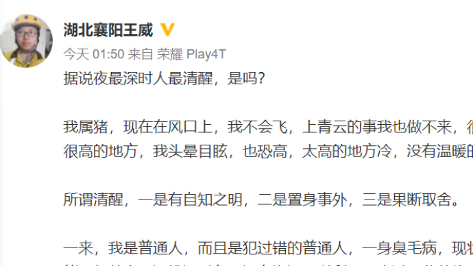 这两天,今年高考陆续放榜,湖北襄阳的外卖小哥王威火了。原来,他从中国农业大学退学后再次参加高考,今年考出623分,一时间成为广泛传播的励志故事。对于突然到来的关注,王威6月28日晚间和29日凌晨,通过个人实名认证微博发文,吐露心声,表示自己会继续清醒,“一是有自知之明,二是置身事外,三是果断取舍”。王威在28日晚22时许写道:“从头到尾,我都说是自己性格原因,视野小,认知差,对上大学这件事有了错误的认识,因为个人原因荒废了学业,最后不得不退学,我没有说过农大一个字坏话,没有说过专业一个字坏话,不知道别有用心的人是啥意思,我自己犯了错我承认……”29日凌晨1点50分,他又写道:“据说夜最深时人最清醒,是吗?我属猪,现在在风口上,我不会飞,上青云的事我也做不来,很大的风把我刮到很高的地方,我头晕目眩,也恐高,太高的地方冷,没有温暖的猪窝。所谓清醒,一是有自知之明,二是置身事外,三是果断取舍。”王威在文中解释:一来,我是普通人,而且是犯过错的普通人,一身臭毛病,现状是个子小,无技能,年龄大,没钱没对象,没有资源可以利用。尝过一些苦头,想获得学历和相应技能来让未来稍微好过一些,有点盼头。认清自己后,做了些准备,就去做了自己想做的事,自认为该做的事。二是,个媒宣传,央媒支持,广大网友的关注,以及存在或否的其它力量的推动,让一个平凡到尘埃里的人站在高台上,光环有不少,眼下的他能带给大家积极的能量也倒还算有点价值,但是过犹不及啊,光线过强就会刺伤人们的眼睛,再说也别忘了,光环的产生更是由于曾经灰暗的对比,万万不可不警惕灰暗对人的伤害。三则,关于过去我可以畅所欲言,无遮无拦,但我觉得没必要,大家明白我是极为普通的人就好,实在想了解,可以私聊,只要有时间,我愿意讲述。关于现在,我还是想继续跑好自己的工作,挣钱攒钱。关于未来,学业为首,做好本分再说其它。文末,王威表示:“再一次感谢大家的关注和支持,让平凡的我感动不已,受宠若惊,也有点恍惚,昏了头脑。你们的建议我都会考虑。求同存异,和平共处,莫吵架,没得意思。人嘛,开心点,洒脱点,和自己好好相处才是最重要的嘛。”根据湖北媒体极目新闻此前报道,王威今年成绩是“语文114分、数学118分、英语129分、历史81分、化学91分、生物学90分,总分623分”。王威介绍,18岁那年,他考入中国农业大学,就读于食品科学与工程专业。独自离开家,到北京开始大学生活,他很快发现,自己有诸多不适应。“有多方面的原因吧。”王威说:“我并不怎么喜欢这个专业,而且对北京的生活也不怎么习惯。入学的时候就有点撤退的想法,但最终没有下定决心,就这样坚持着。”报道透露,性格内向的他,上学期间,就经常出去打工兼职。2017年,由于对学业的疏远,他选择了退学。此后,他打过好几份工:给小学生做辅导老师、在制衣厂当搬运工……让他感悟最多的,就是送外卖的经历。极目新闻记者从美团外卖方面了解到,待王威收到大学录取通知书后,将向其提供1万元现金奖励,帮助他更轻松地完成学业,没有后顾之忧。(本文来自澎湃新闻,更多原创资讯请下载“澎湃新闻”APP)