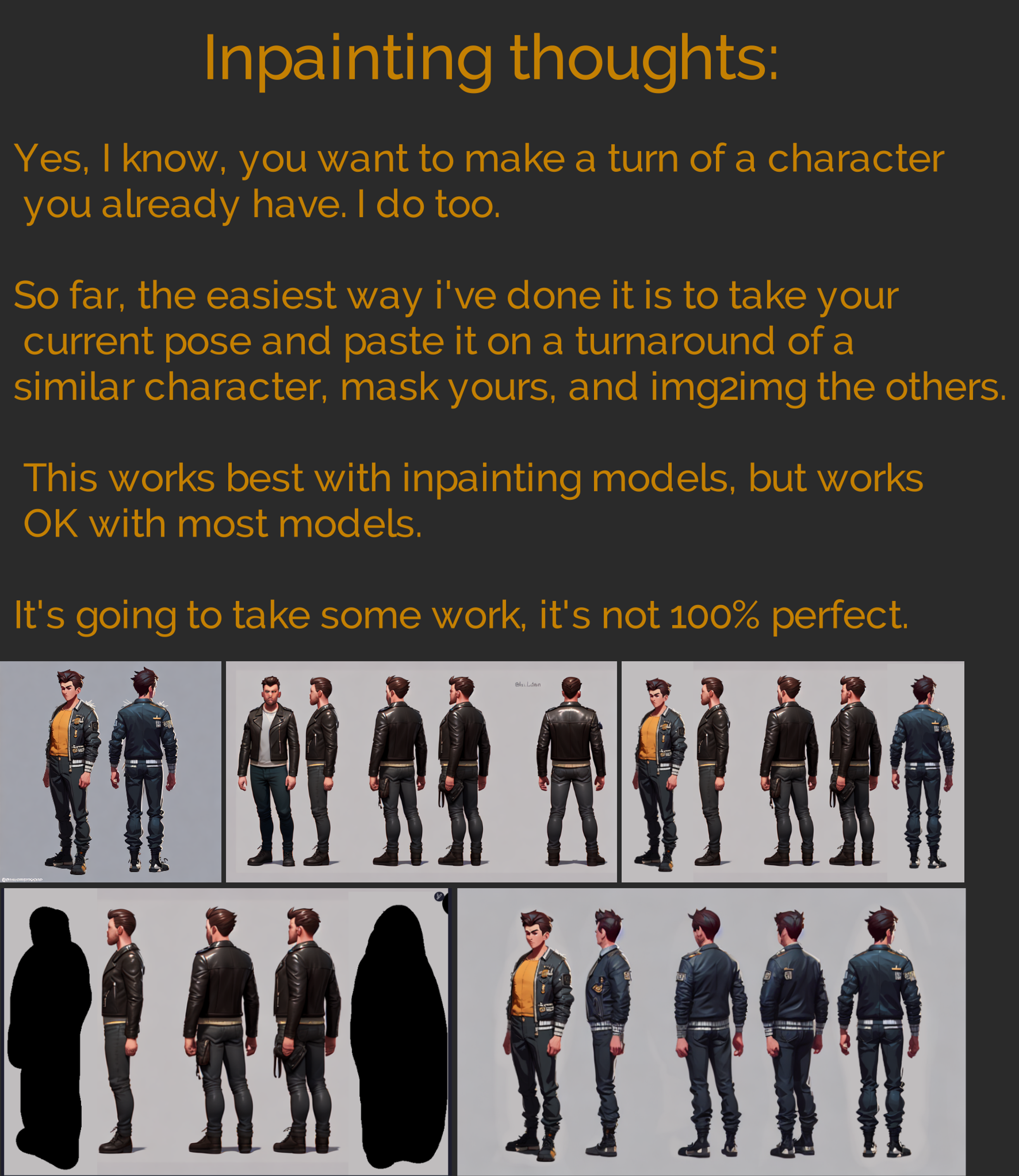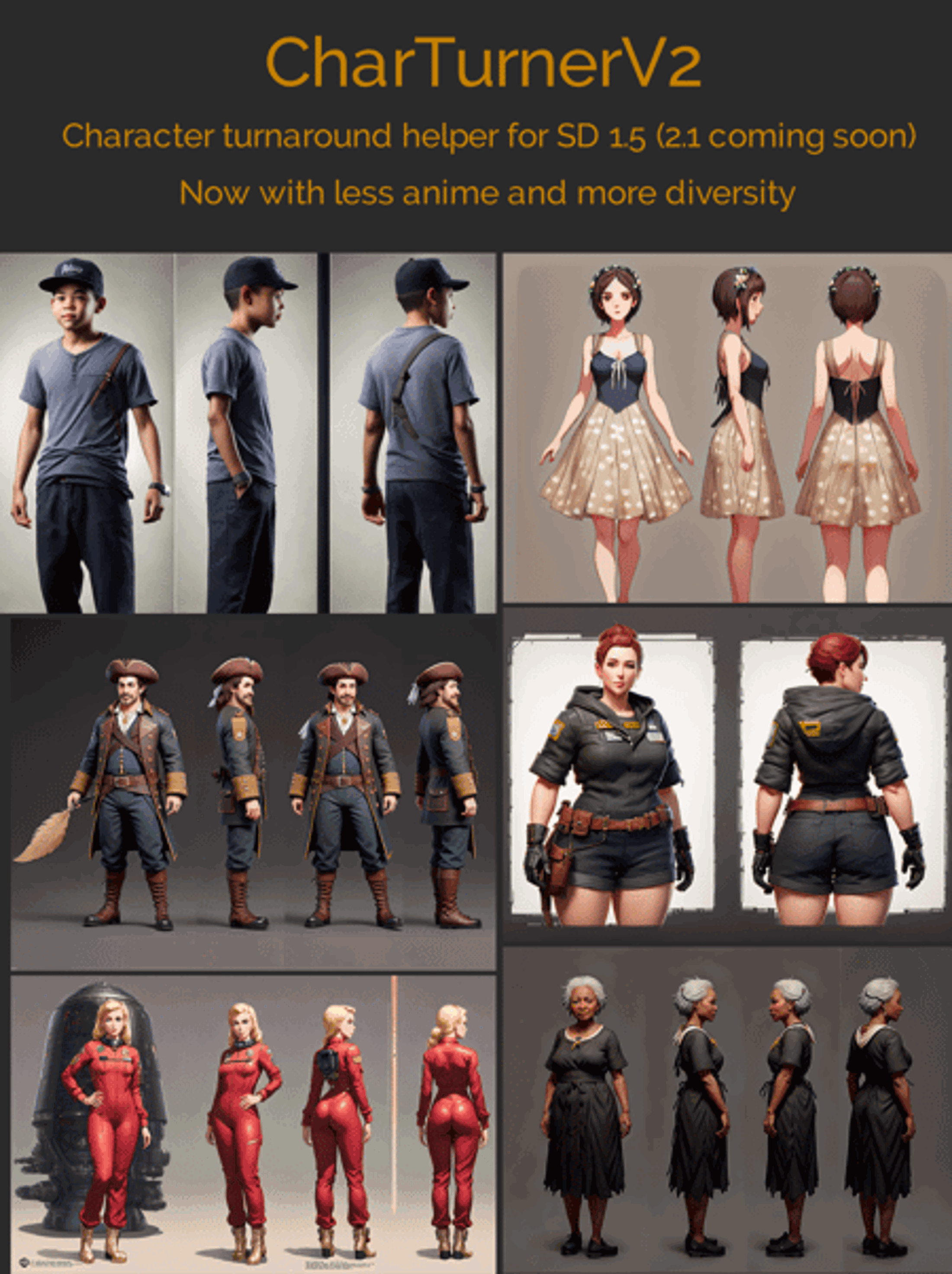 Helps create multiple full body views of a character. The intention is to get at least a front and back, and ideally, a front, 3/4, profile, 1/4 and back versions, in the same outfit.