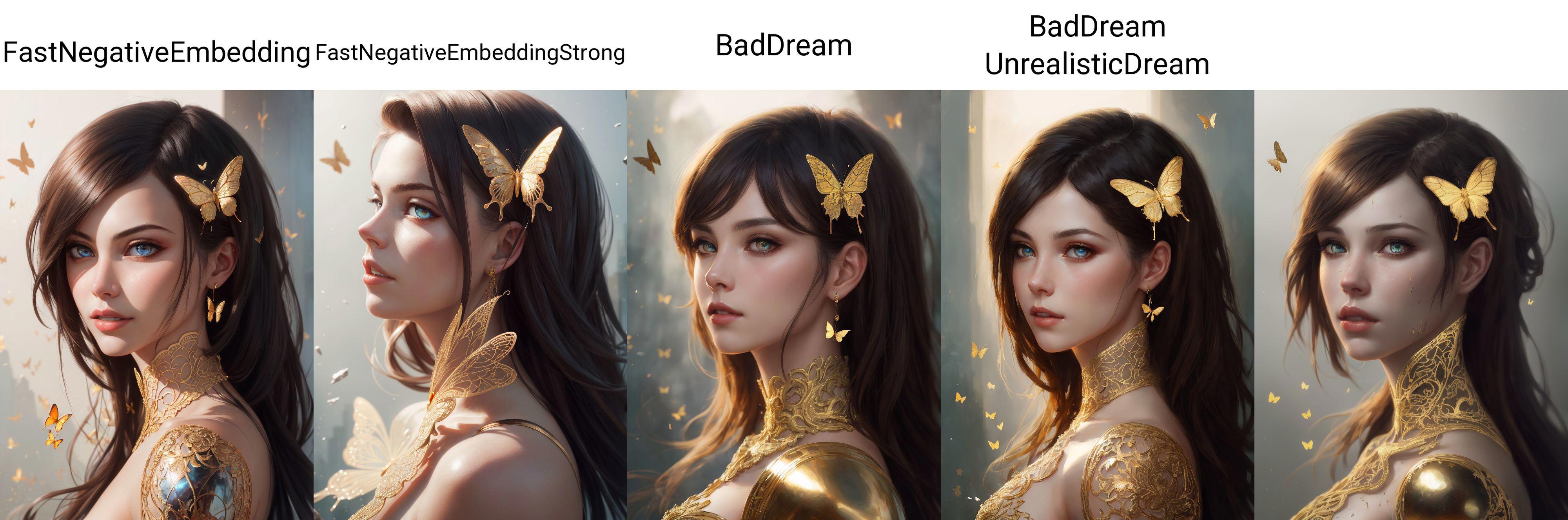 Since I was refactoring my usual negative prompt with FastNegativeEmbedding, why not do the same with my super long DreamShaper negative prompts?