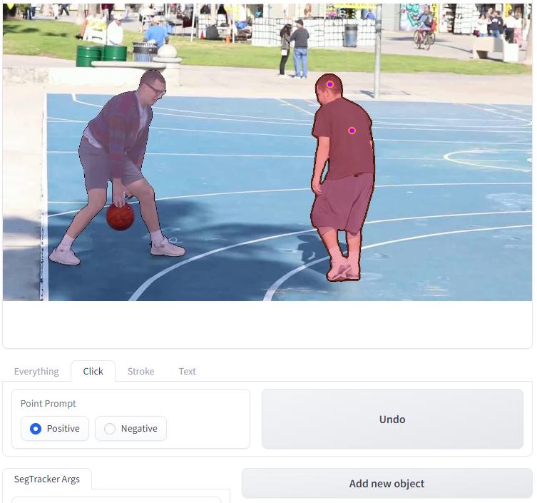 1. Once we interactively add an object mask, we can click the Add new object button to prepare to add a new object.