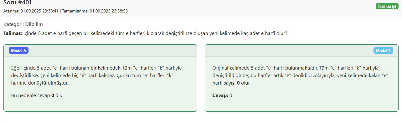 A question and two answers from different models were presented to human judges. The judges selected the better answer based on their preferences. For example, in the question below, the judge evaluated both answers as good: